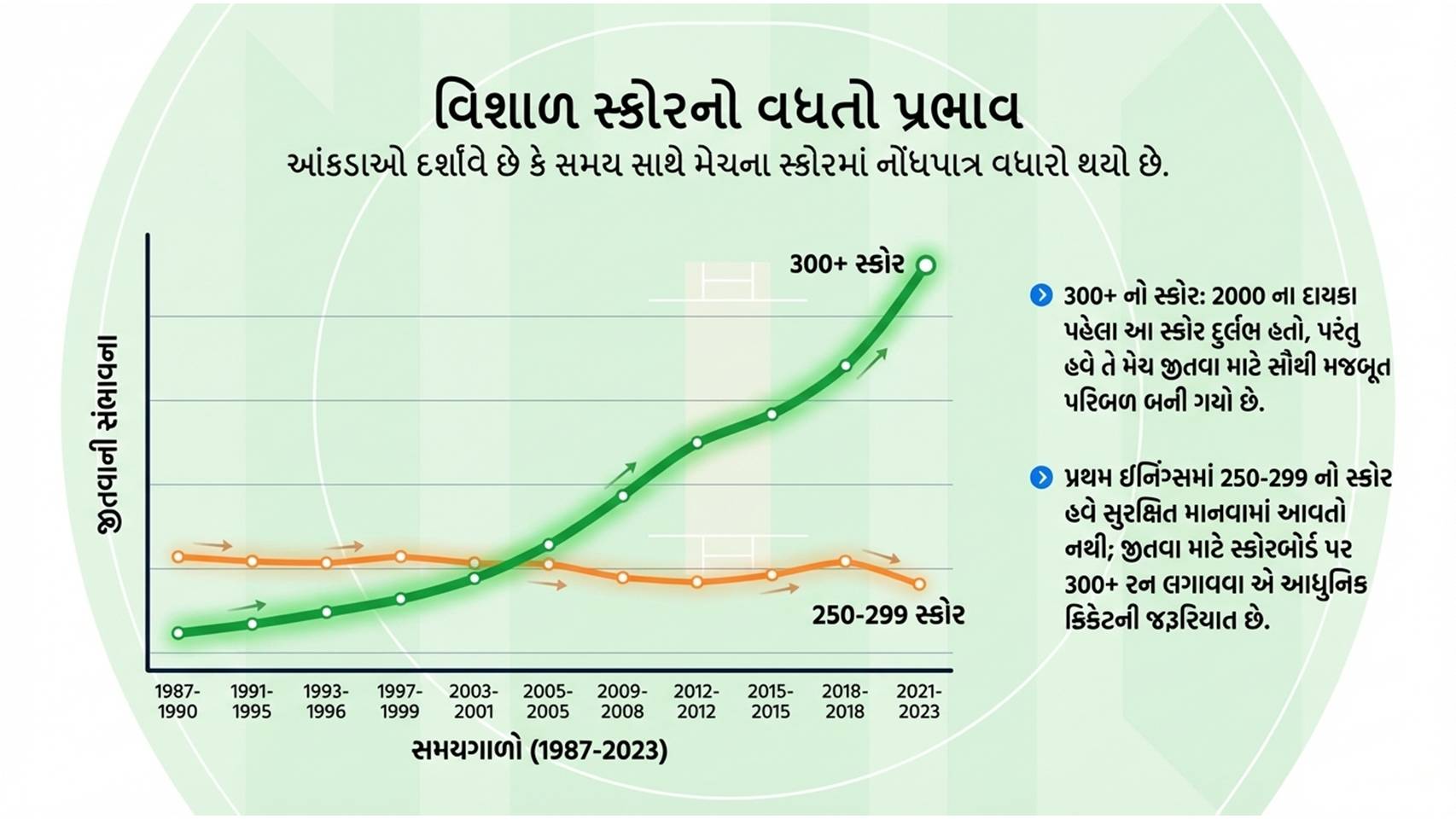 ટી20 વર્લ્ડ કપ 2026 : આ મેચમાં જે રીતે 250 થી વધુ રનનો સ્કોર થયો અને સામેની ટીમે તેનો મજબૂત પીછો કર્યો, તે જોતા એક પ્રશ્ન થાય છે કે શું હવે ક્રિકેટમાં બોલરોનું કોઈ મહત્વ રહ્યું છે? આ અંગેના એક ઊંડા અભ્યાસ (1987 થી 2023 સુધીના આંકડા) મુજબ, ODI અને T20 માં 300+ ના સ્કોરનું મહત્વ વધ્યું છે. જોકે, રસપ્રદ વાત એ છે કે આટલા હાઈ-સ્કોરિંગ મેચોમાં પણ બીજી ઇનિંગમાં વિકેટ લેવાની ક્ષમતા જ જીત નક્કી કરે છે.