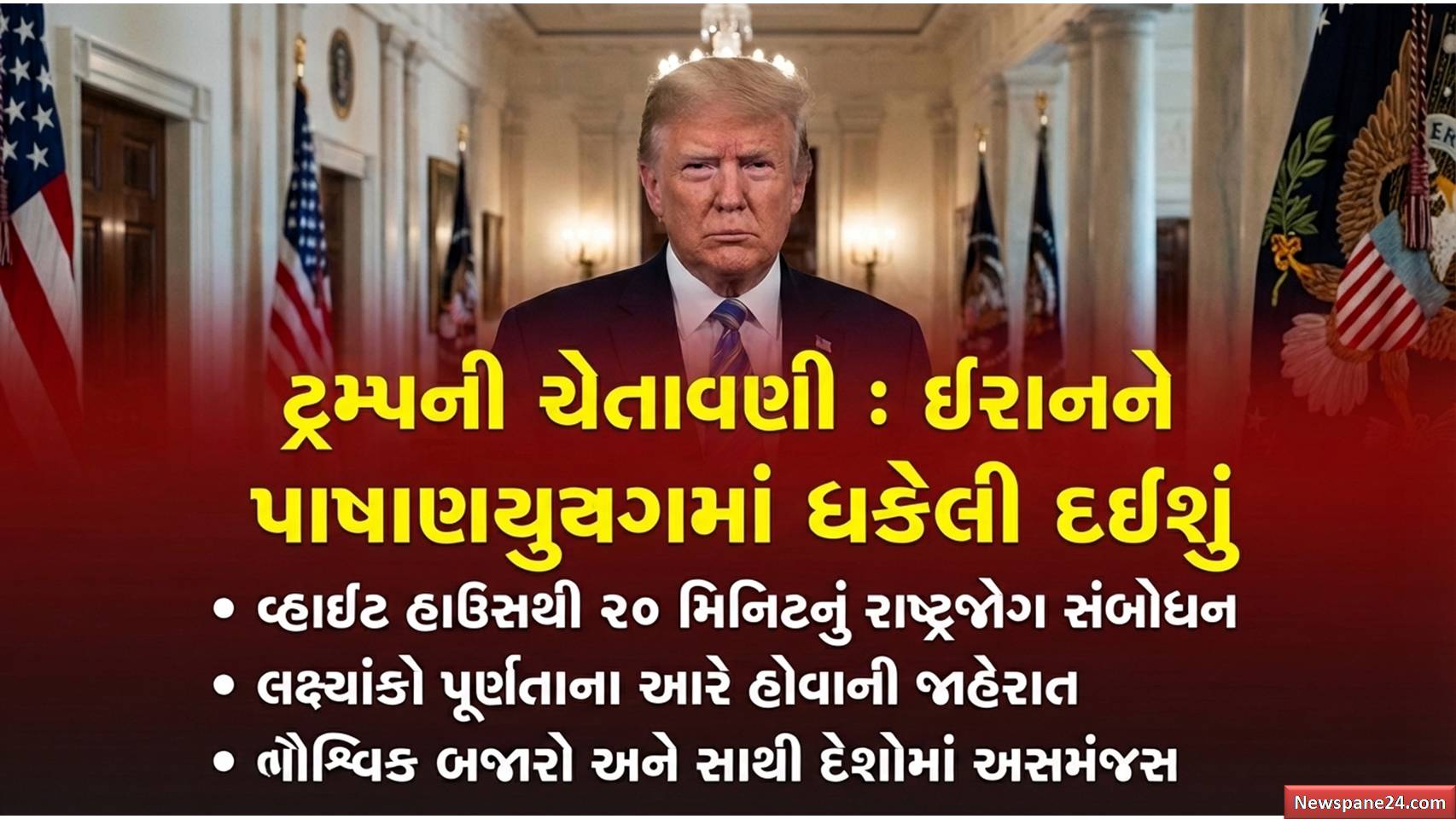 ટ્રમ્પની ચેતાવણી : વોશિંગ્ટન: વિશ્વ અત્યારે એક એવા વળાંક પર ઉભું છે જ્યાં શાંતિની આશા ઓછી અને યુદ્ધના નગારા વધુ ગુંજી રહ્યા છે. વ્હાઇટ હાઉસના ઐતિહાસિક ‘ક્રોસ હોલ’ માંથી જ્યારે અમેરિકી રાષ્ટ્રપતિ ડોનાલ્ડ ટ્રમ્પે રાષ્ટ્રને સંબોધન કર્યું, ત્યારે સમગ્ર વિશ્વની નજર ટીવી સ્ક્રીન પર ટકેલી હતી,. આશરે 20 મિનિટના આ આક્રમક સંબોધનમાં ટ્રમ્પે સ્પષ્ટ કરી દીધું કે અમેરિકા હવે ઈરાનને છોડવાના મૂડમાં નથી,. તેમણે દાવો કર્યો કે ઈરાન વિરુદ્ધના સૈન્ય લક્ષ્યો લગભગ પૂર્ણ થઈ ગયા છે અને હવે માત્ર ‘કામ પૂરું કરવાનું’ બાકી છે,.