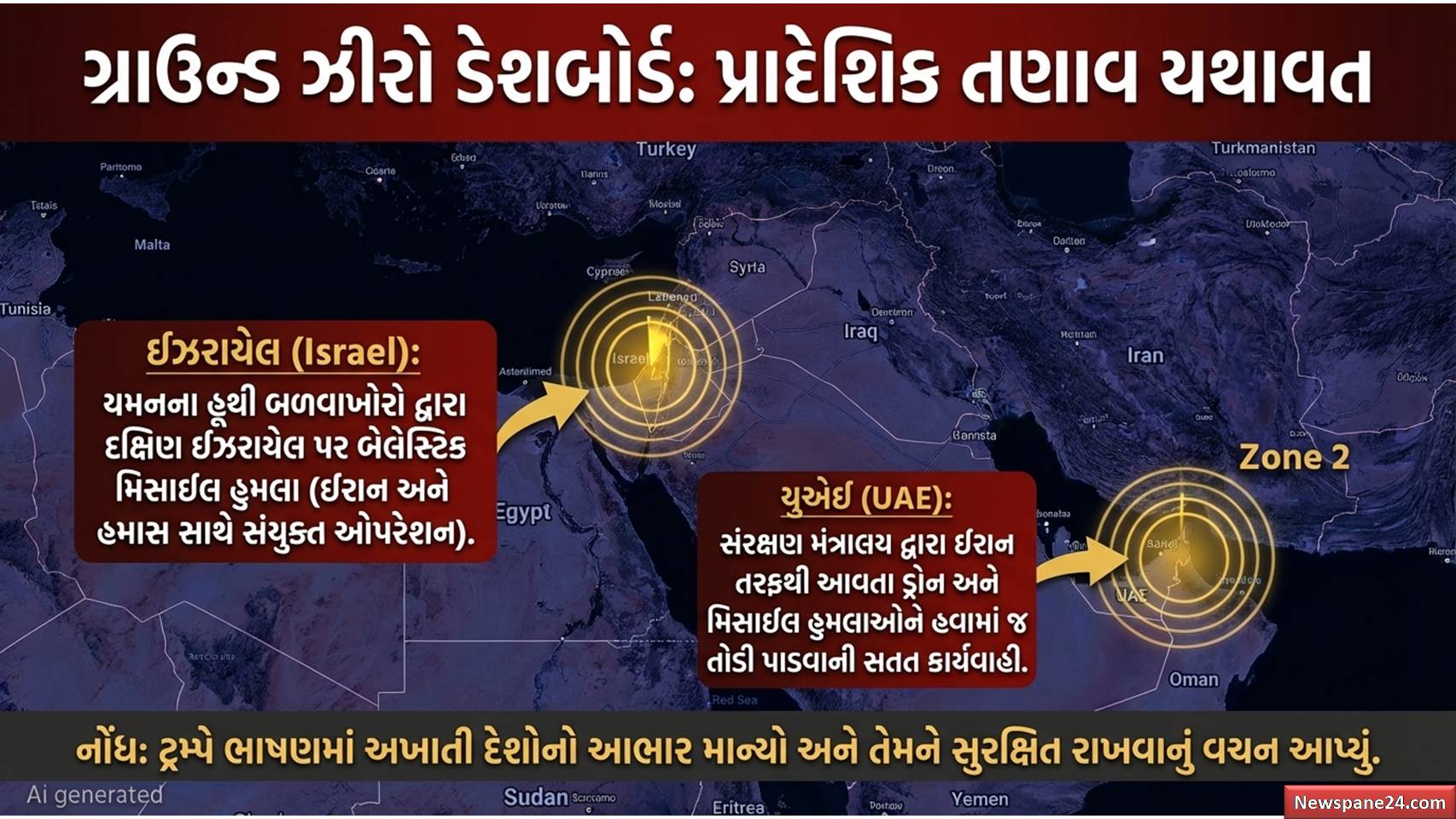 ટ્રમ્પની ચેતાવણી : ટ્રમ્પનું ભાષણ પૂરું થયાના માત્ર 15 મિનિટમાં જ ઈરાને ઈઝરાયેલ પર ફરીથી મિસાઈલો છોડી હતી,. ઈઝરાયેલ ડિફેન્સ ફોર્સિસ (IDF) એ પુષ્ટિ કરી છે કે ઈરાન તરફથી સતત હુમલાઓ થઈ રહ્યા છે. દરમિયાન, સંયુક્ત આરબ અમીરાત (UAE) એ પણ તેમના ક્ષેત્રમાં આવતી ઈરાની મિસાઈલો અને ડ્રોનને તોડી પાડ્યા છે.