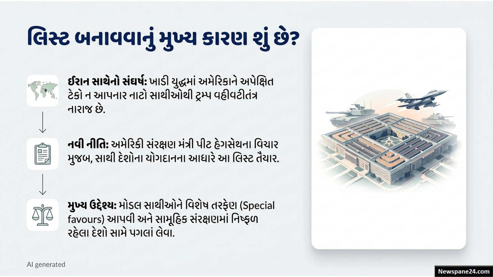સૂત્રોના જણાવ્યા અનુસાર, આ યાદી નાટોના સેક્રેટરી જનરલ માર્ક રુટ્ટેની વોશિંગ્ટન મુલાકાત પહેલા જ તૈયાર કરી લેવામાં આવી હતી. આ લિસ્ટ પાછળનો મુખ્ય હેતુ એવા દેશોને ઈનામ આપવાનો છે જેમણે અમેરિકાના ઈરાન પરના યુદ્ધમાં ખુલ્લેઆમ સાથ આપ્યો છે, અને એવા દેશોને સજા કરવાનો છે જેમણે પાછળ હટી જવાનું પસંદ કર્યું છે.