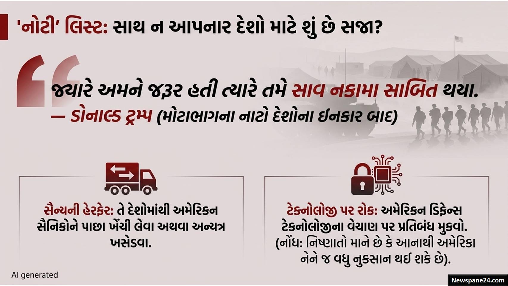તાજેતરમાં સોશિયલ મીડિયા પર ટ્રમ્પે લખ્યું હતું કે, “જ્યારે અમને જરૂર હતી ત્યારે નાટો ત્યાં નહોતું, અને જો ફરીથી જરૂર પડશે તો પણ તેઓ ત્યાં નહીં હોય”. આ નિવેદન નાટોની વિશ્વસનીયતા પર મોટા સવાલો ઉભા કરે છે.