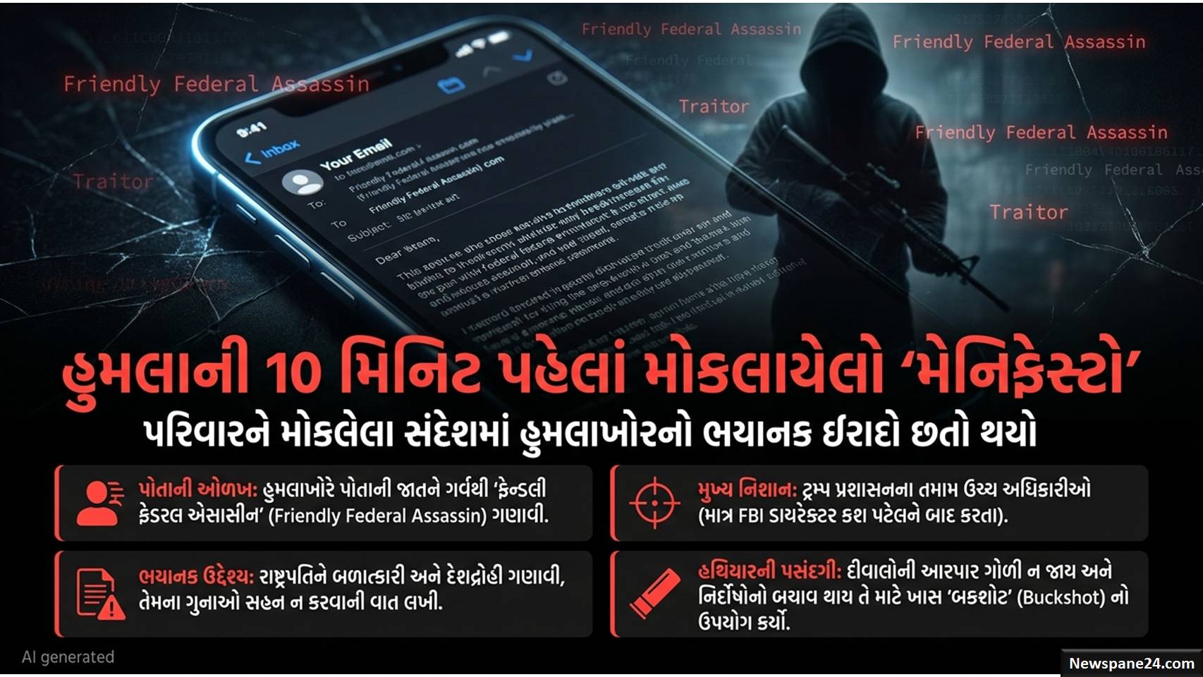 ટ્રમ્પ : તપાસકર્તાઓના જણાવ્યા અનુસાર, કેલિફોર્નિયાના ટોરેન્સના રહેવાસી કોલ એલને ગોળીબાર શરૂ કરતાના માત્ર ૧૦ મિનિટ પહેલા જ તેના પરિવારજનોને એક દસ્તાવેજ મોકલ્યો હતો. આ લખાણમાં તેણે પોતાને “ફ્રેન્ડલી ફેડરલ એસેસિન” (મૈત્રીપૂર્ણ સંઘીય હત્યારો) તરીકે ઓળખાવ્યો હતો. ૧૦૦૦ થી વધુ શબ્દોના આ મેનિફેસ્ટોમાં તેણે ટ્રમ્પ વહીવટીતંત્ર સામે પોતાનો ઉગ્ર આક્રોશ વ્યક્ત કર્યો હતો. તેના લખાણોમાં સરકાર વિરોધી ભાવનાઓ સ્પષ્ટપણે દેખાઈ આવતી હતી.