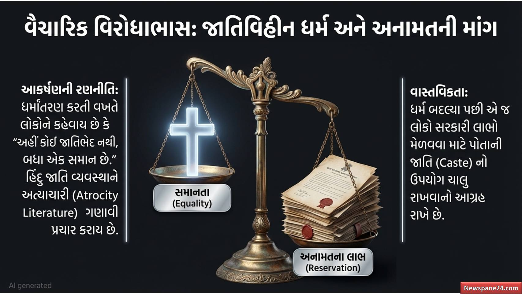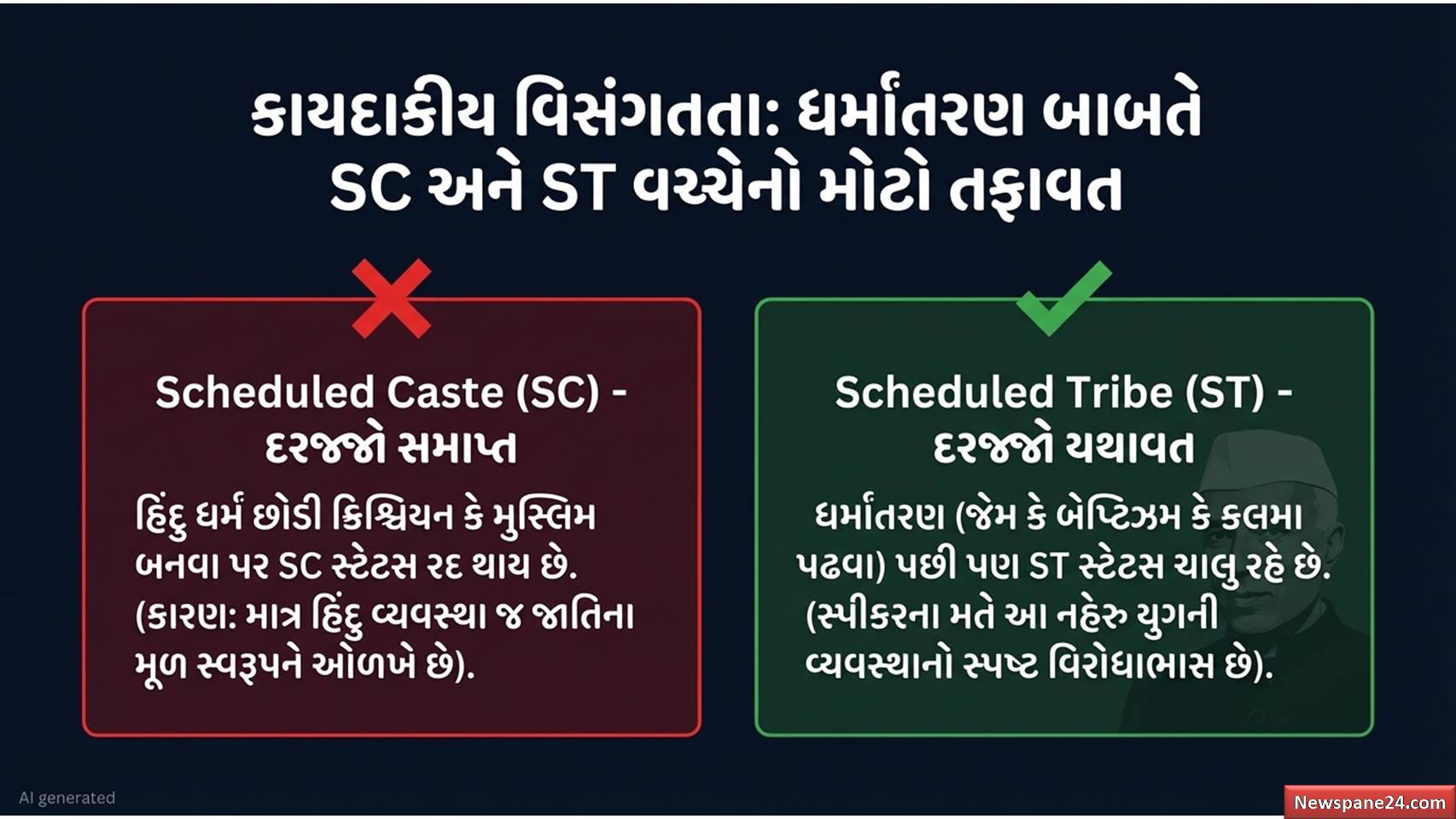 ધર્મ પરિવર્તન : લેખમાં આપેલી વિગત મુજબ, ST (અનુસૂચિત જનજાતિ) નો દરજ્જો ધર્મ પરિવર્તન પછી પણ ઘણીવાર જળવાઈ રહે છે કારણ કે તે તેમની મૂળભૂત આદિવાસી સંસ્કૃતિ સાથે જોડાયેલું છે. પરંતુ SC માટે નિયમો અલગ છે. હિન્દુ વ્યવસ્થામાં જે જાતિઓ છે, તે જો ખ્રિસ્તી કે ઇસ્લામ જેવા વિદેશી મૂળના ધર્મોમાં જાય, તો તેમનો જૂનો જાતિગત દરજ્જો ટકી શકતો નથી, કારણ કે આ ધર્મો પોતે જ કહે છે કે તેમનામાં કોઈ જાતિ વ્યવસ્થા નથી.