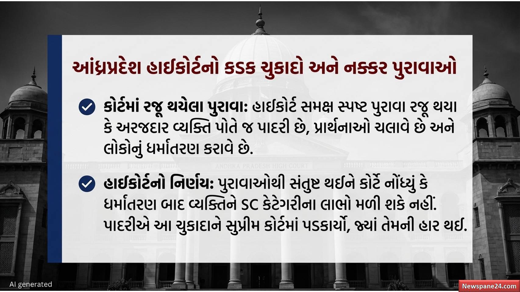 સ્ત્રોતો મુજબ, આંધ્રપ્રદેશનો એક કિસ્સો સામે આવ્યો હતો જ્યાં એક વ્યક્તિ પોતે પાસ્ટર બનીને પ્રાર્થના સભાઓ સંચાલિત કરતો હતો. જ્યારે હિન્દુ સંગઠનોએ તેને પડકાર્યો, ત્યારે તેણે પોતાની જાતને SC ગણાવીને ‘SC/ST એક્ટ’ હેઠળ કેસ નોંધાવ્યો હતો. જોકે, આંધ્રપ્રદેશ હાઈકોર્ટે પુરાવાઓને આધારે સ્પષ્ટ કર્યું કે તે વ્યક્તિ ખ્રિસ્તી બની ચૂક્યો હોવાથી તેને SC ના લાભ મળી શકે નહીં, જેને સુપ્રીમ કોર્ટે પણ યોગ્ય ઠેરવ્યું છે.