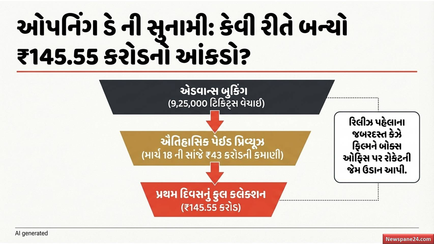 ધુરંધર 2 : ફિલ્મની સફળતાની ઝલક તેના પ્રીવ્યુ શોથી જ મળી ગઈ હતી. પેઇડ પ્રીવ્યુ દ્વારા ફિલ્મે 43 કરોડ રૂપિયા કમાઈને નવો રેકોર્ડ બનાવ્યો હતો, જે અગાઉ ‘They Call Him OG’ પાસે હતો. 19 માર્ચે જ્યારે ફિલ્મ સત્તાવાર રીતે રિલીઝ થઈ, ત્યારે તેણે પહેલા દિવસે ભારતમાં 102.55 કરોડ રૂપિયા (નેટ) ની કમાણી કરી હતી. જો પેઇડ પ્રીવ્યુના આંકડા ઉમેરવામાં આવે તો પહેલા દિવસની કુલ કમાણી 145.55 કરોડ રૂપિયા સુધી પહોંચી હતી. હિન્દી વર્ઝનમાં જ ફિલ્મે પહેલા દિવસે 99.10 કરોડ રૂપિયાની કમાણી કરીને ‘પુષ્પા 2’ ના 70.30 કરોડના રેકોર્ડને ધ્વસ્ત કરી દીધો હતો.