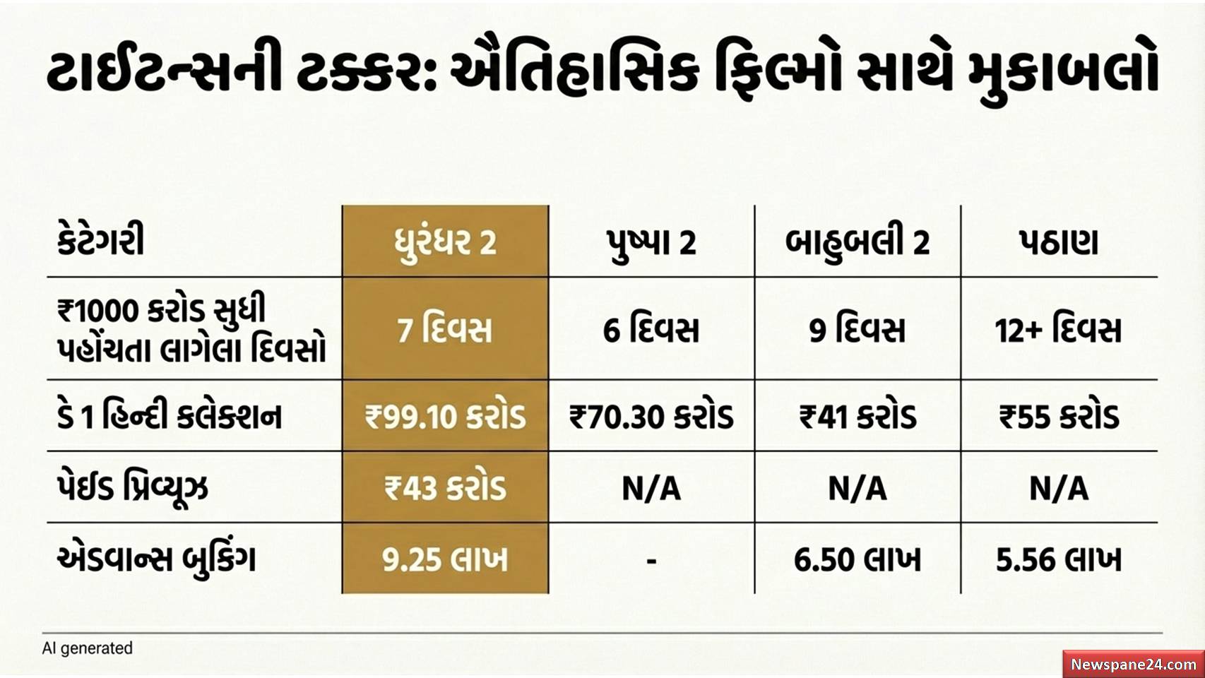 ધુરંધર 2 : જ્યારે પણ રેકોર્ડ્સની વાત આવે ત્યારે એસ.એસ. રાજામૌલીની ફિલ્મોના નામ ટોચ પર હોય છે, પરંતુ ‘ધુરંધર 2’ એ કમાણીની ગતિમાં ‘બાહુબલી 2’ ને પણ પછડાટ આપી છે. ‘બાહુબલી 2’ ને 1000 કરોડના આંકડા સુધી પહોંચવામાં 9 દિવસ લાગ્યા હતા, જ્યારે રણવીરની ફિલ્મે આ પરાક્રમ માત્ર 7 દિવસમાં કરી બતાવ્યું છે. આ ઉપરાંત, આ ફિલ્મે ‘RRR’, ‘KGF ચેપ્ટર 2’, ‘જવાન’ અને ‘પઠાણ’ જેવી બ્લોકબસ્ટર ફિલ્મો કરતા પણ વધુ ઝડપથી કમાણીના રેકોર્ડ્સ તોડ્યા છે.