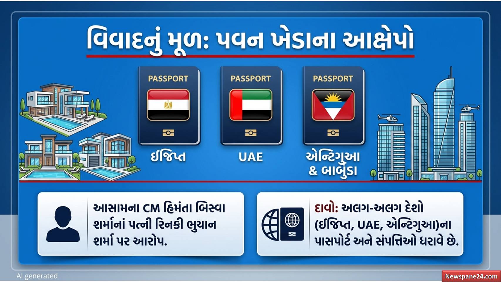 પવન ખેડા : વાત એમ છે કે, ચૂંટણીના માહોલમાં પવન ખેડાએ એક સનસનાટીભર્યો આરોપ લગાવ્યો હતો. તેમણે દાવો કર્યો હતો કે હિમંતા બિસ્વા સરમાની પત્ની રિનકી ભુયાન શર્મા પાસે અલગ-અલગ દેશોના પાસપોર્ટ છે. ખેડાએ ઈજિપ્ત, યુએઈ (UAE), એન્ટિગુઆ અને બરમુડા જેવા દેશોના નામ લીધા હતા અને કહ્યું હતું કે તેમની પાસે આ દેશોના પાસપોર્ટ અને પ્રોપર્ટીઝ છે. સામાન્ય રીતે ચૂંટણીમાં આવા આરોપો લાગતા હોય છે અને નેતાઓ તેને ભૂલી જતા હોય છે, પરંતુ અહીં હિમંતા બિસ્વા સરમાએ આ બાબતને ગંભીરતાથી લીધી છે.
