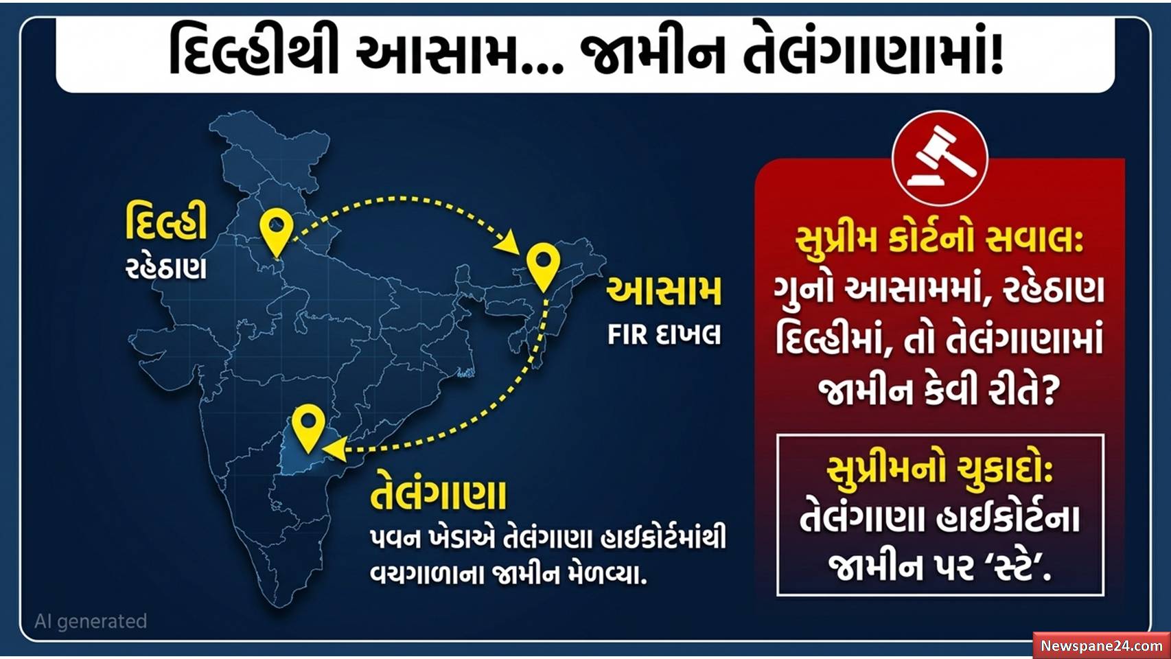 પવન ખેડા : જ્યારે આસામમાં એફઆઈઆર થઈ, ત્યારે પવન ખેડા દિલ્હીમાં હતા. ધરપકડથી બચવા માટે તેમણે એક હોશિયાર ચાલ ચાલી અને તેલંગાણા હાઈકોર્ટ પહોંચ્યા. ત્યાં તેમણે એવી દલીલ કરી કે તેમની પત્નીની હૈદરાબાદમાં પ્રોપર્ટી છે, ભલે તેમનું આધાર કાર્ડ દિલ્હીનું હોય. આ દલીલના આધારે તેલંગાણા હાઈકોર્ટે તેમને ૧૦ દિવસના વચગાળાના જામીન (Interim Anticipatory Bail) આપી દીધા અને આદેશ આપ્યો કે આ દરમિયાન તેઓ ગુવાહાટી હાઈકોર્ટમાં જામીન માટે અરજી કરી શકે છે.