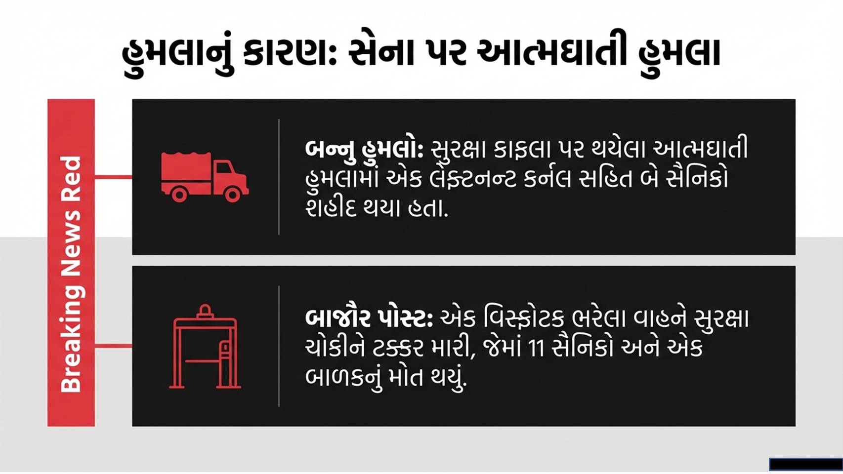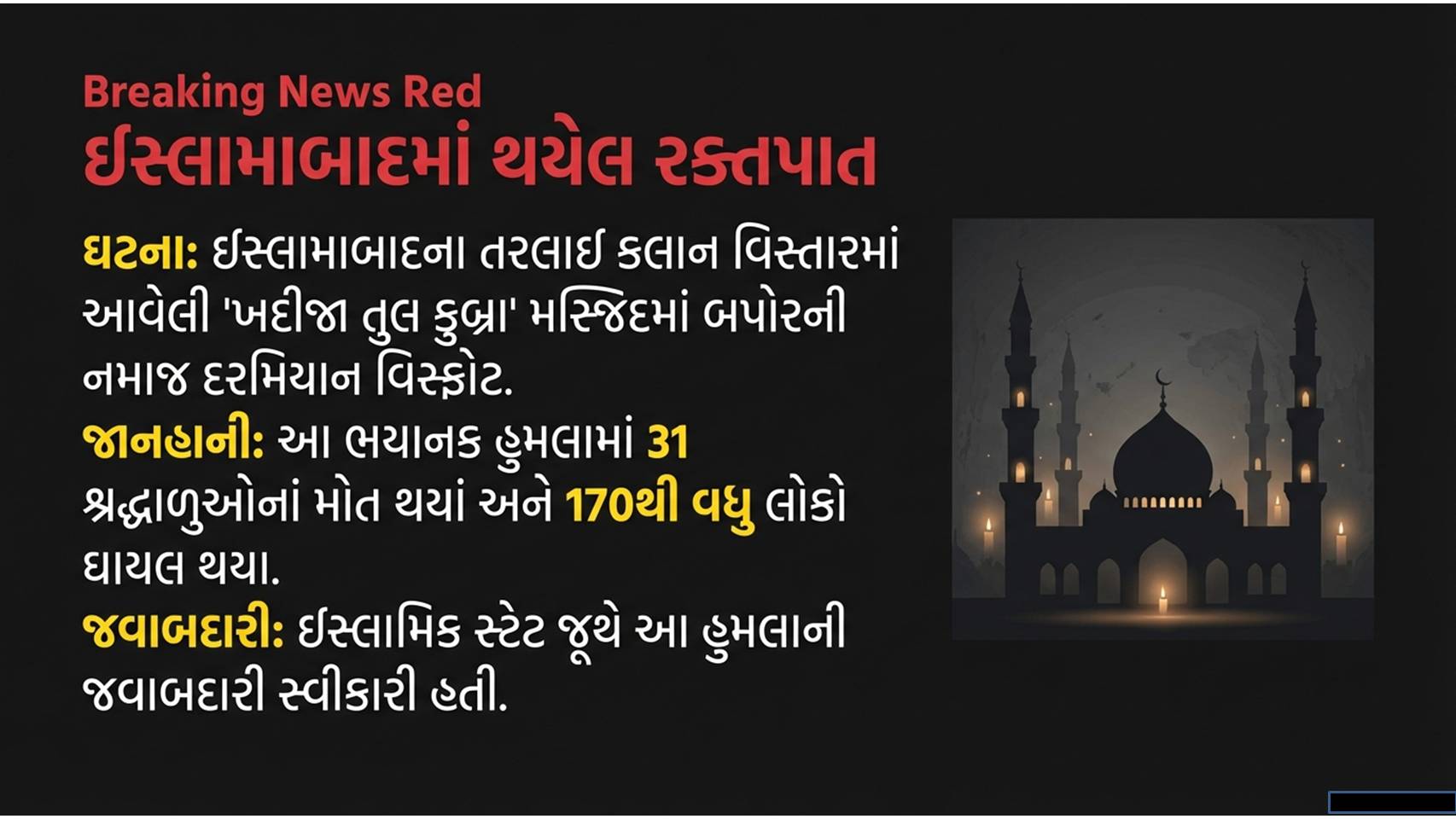 પાકિસ્તાનનો અફધાનિસ્તાન પર હુમલો : તાજેતરમાં જ પાકિસ્તાનના પાટનગર ઇસ્લામાબાદની એક શિયા મસ્જિદમાં થયેલા આત્મઘાતી વિસ્ફોટે પાકિસ્તાનની આંતરિક સુરક્ષાની પોલ ખોલી નાખી હતી, જેમાં 31 નિર્દોષ લોકોએ જીવ ગુમાવ્યા હતા. આ ઉપરાંત, બાજૌર અને બન્નુ જિલ્લામાં થયેલા હુમલાઓમાં પાકિસ્તાનના એક લેફ્ટનન્ટ કર્નલ સહિત અનેક સૈનિકો માર્યા ગયા છે. આ હુમલાખોરો અફઘાન નાગરિકો હોવાનું બહાર આવતા પાકિસ્તાન સરકાર હવે અફઘાનિસ્તાનની તાલિબાન સરકાર પર દોષારોપણ કરી રહી છે.