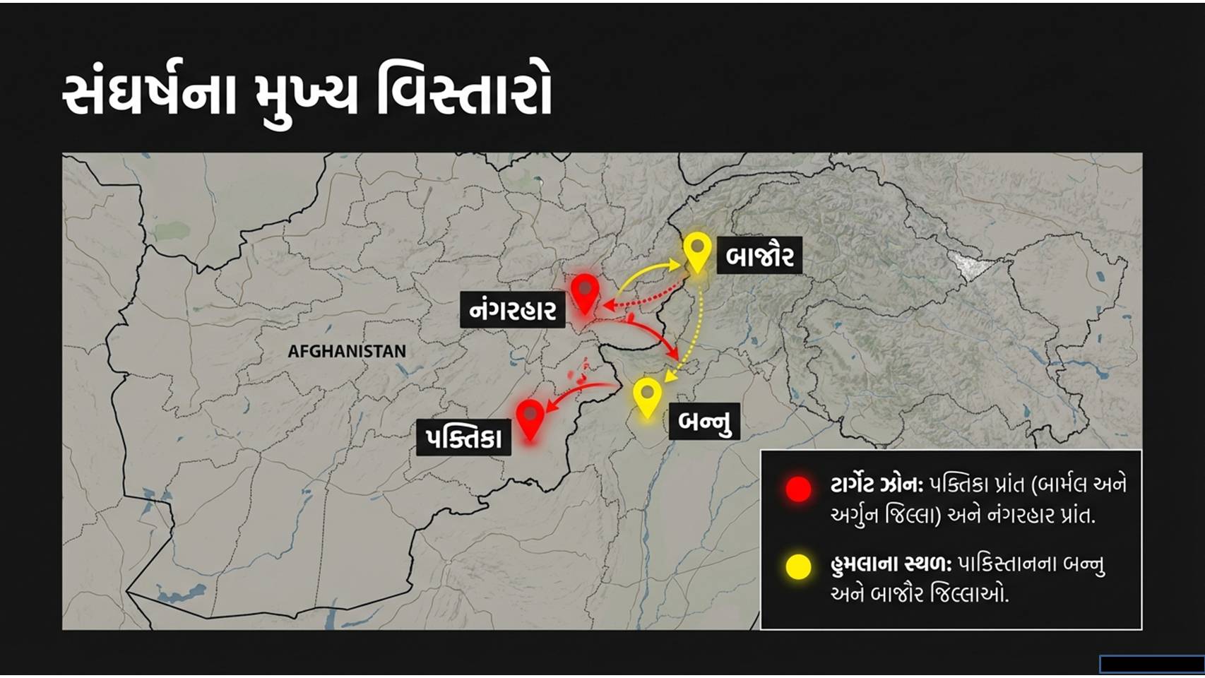 પાકિસ્તાનનો અફધાનિસ્તાન પર હુમલો : પાકિસ્તાની સત્તાવાળાઓના જણાવ્યા મુજબ, પક્તિકા પ્રાંતના બાર્મલ જિલ્લામાં એક મદરેસાને નિશાન બનાવવામાં આવી હતી, જ્યારે નંગરહાર પ્રાંતના ખોગયાની, બહસોદ અને ઘાની ખેલ જિલ્લાઓમાં પણ હવાઈ હુમલા કરવામાં આવ્યા હતા. પાકિસ્તાની માહિતી મંત્રાલયે સોશિયલ મીડિયા પર પુષ્ટિ કરી છે કે આ ઓપરેશનમાં ‘ફિત્ના અલ-ખ્વારીજ’ (FAK) અને ‘દાએશ ખોરાસન પ્રાંત’ (DKP) ના સાત મુખ્ય કેમ્પો અને ઠેકાણાઓનો નાશ કરવામાં આવ્યો છે.