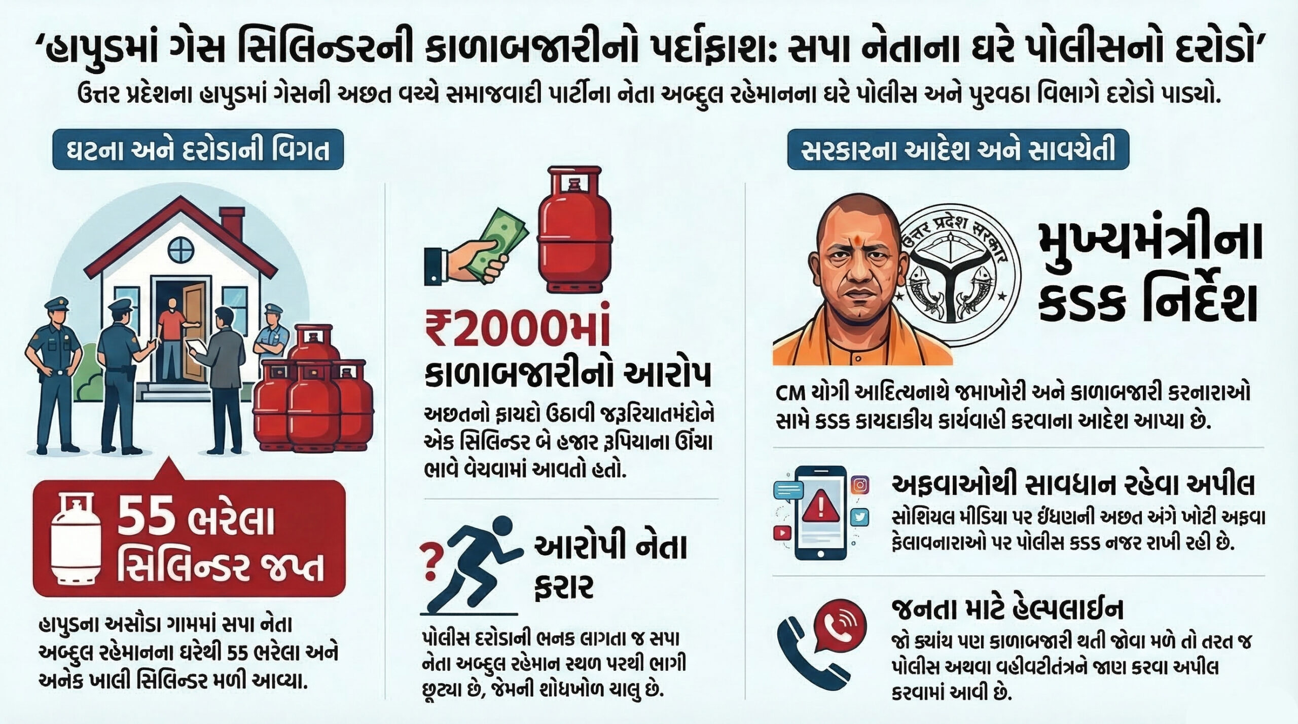 બ્લેક માર્કેટિંગ : સ્થાનિક લોકોના જણાવ્યા અનુસાર, જ્યારે આખા વિસ્તારમાં ગેસની અછત હતી, ત્યારે નેતાજી લોકોની મજબૂરીનો ભરપૂર ફાયદો ઉઠાવી રહ્યા હતા. આરોપ છે કે તેઓ જરૂરિયાતમંદ લોકોને એક સિલિન્ડર ₹2000 જેવી માતબર રકમમાં વેચી રહ્યા હતા. જનતાની સેવા કરવાના નામે નેતાજીએ પોતાના અંગત ફાયદા માટે ગેસના સિલિન્ડરોનો ગેરકાયદેસર જથ્થો જમા કરી રાખ્યો હતો.