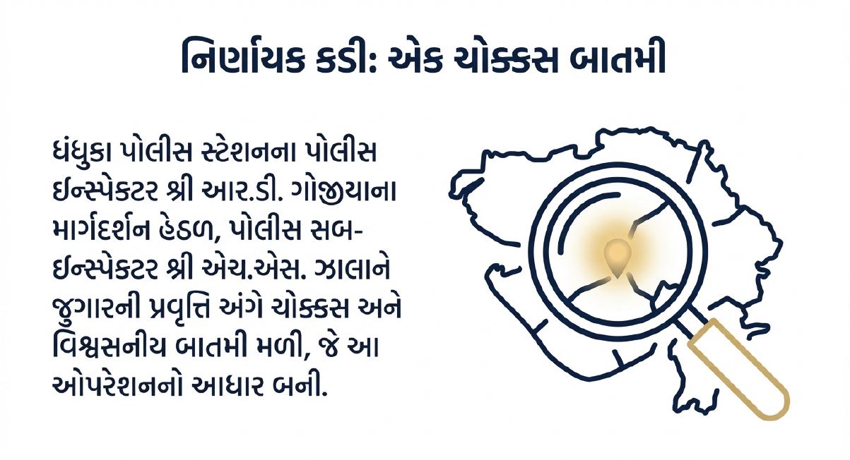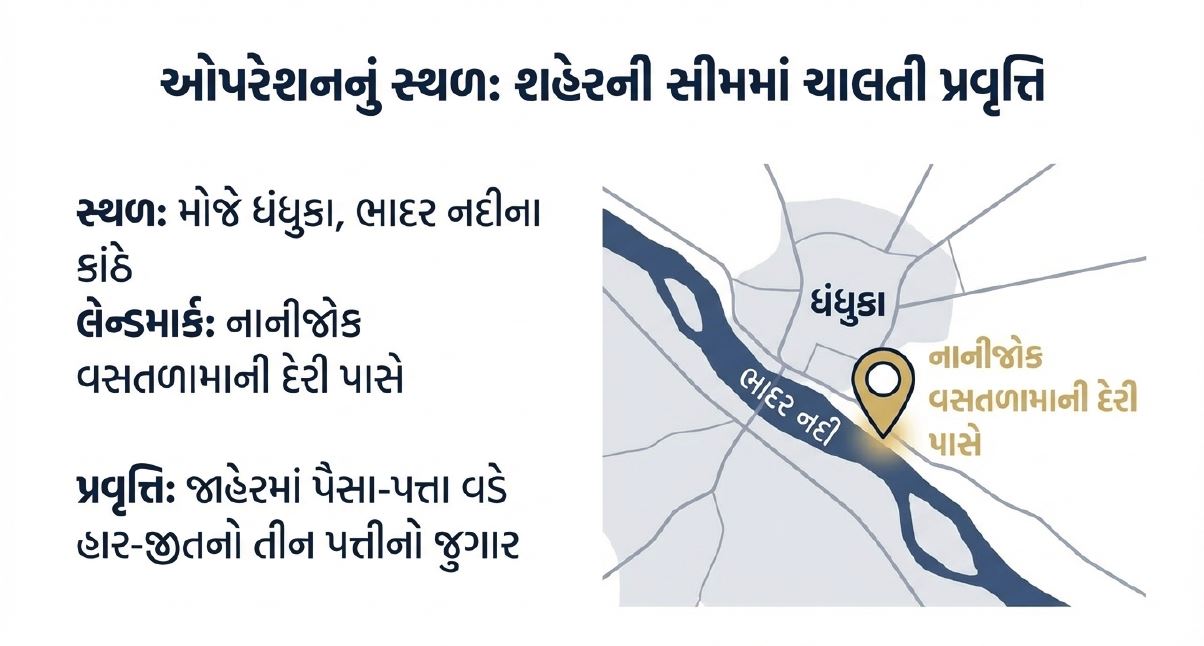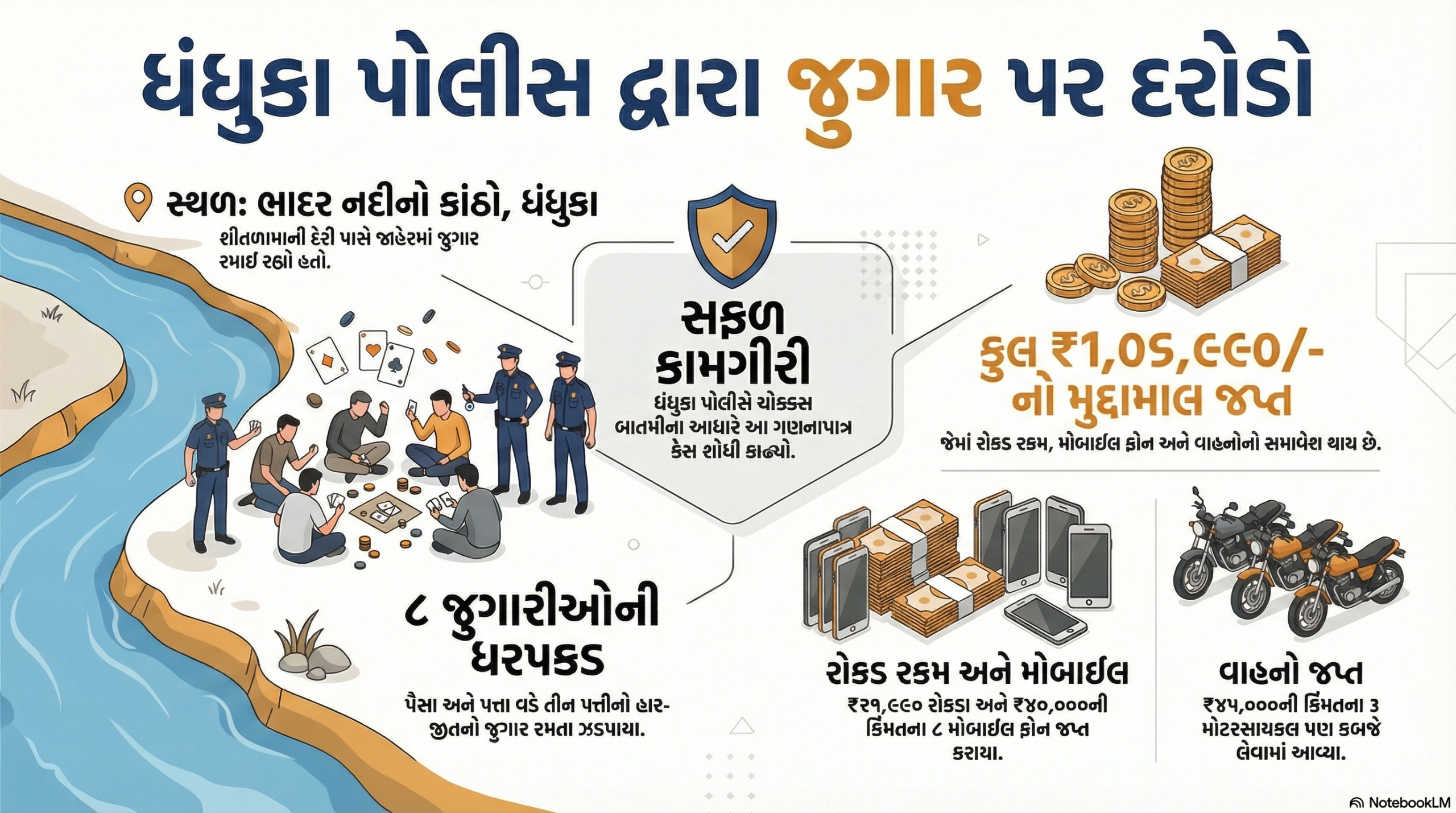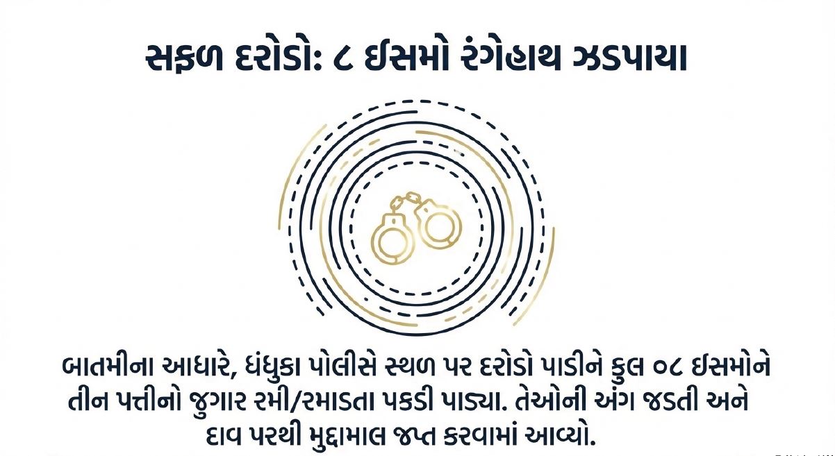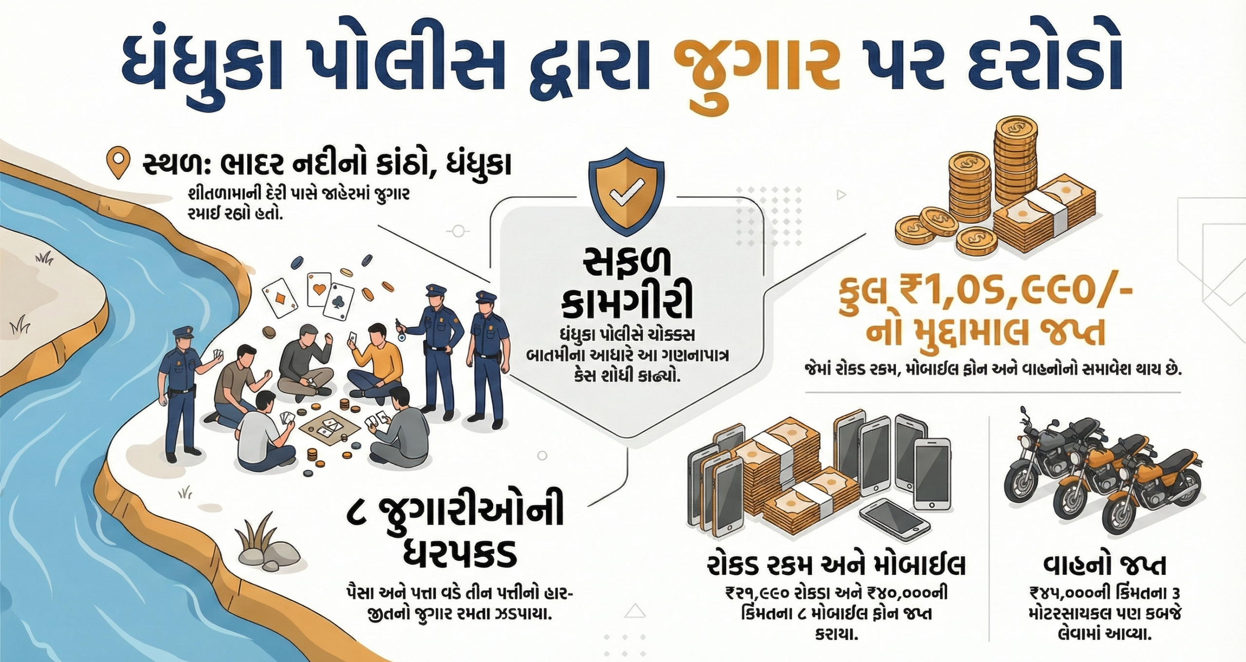 ધંધુકા ડિવિઝનના ઈ.નાયબ પોલીસ અધીક્ષક શ્રી આસ્થા રણાના માર્ગદર્શન હેઠળ ધંધુકા પોલીસ સ્ટેશનના પી.આઈ. આર.ડી. ગોજીયા અને પી.એસ.આઈ. એચ.એસ. ઝાલાની ટીમ પેટ્રોલિંગમાં હતી,. આ દરમિયાન પોલીસને ચોક્કસ બાતમી મળી હતી કે ધંધુકાના નાનીજોક શીતળા માતાની દેરી પાસે ભાદર નદીના કાંઠે જાહેરમાં કેટલાક ઇસમો હાર-જીતનો જુગાર રમી રહ્યા છે. પોલીસે બાતમીવાળા સ્થળે દરોડો પાડતા તીન પત્તીનો જુગાર રમતા કુલ 8 ઇસમો રંગેહાથ ઝડપાઈ ગયા હતા.