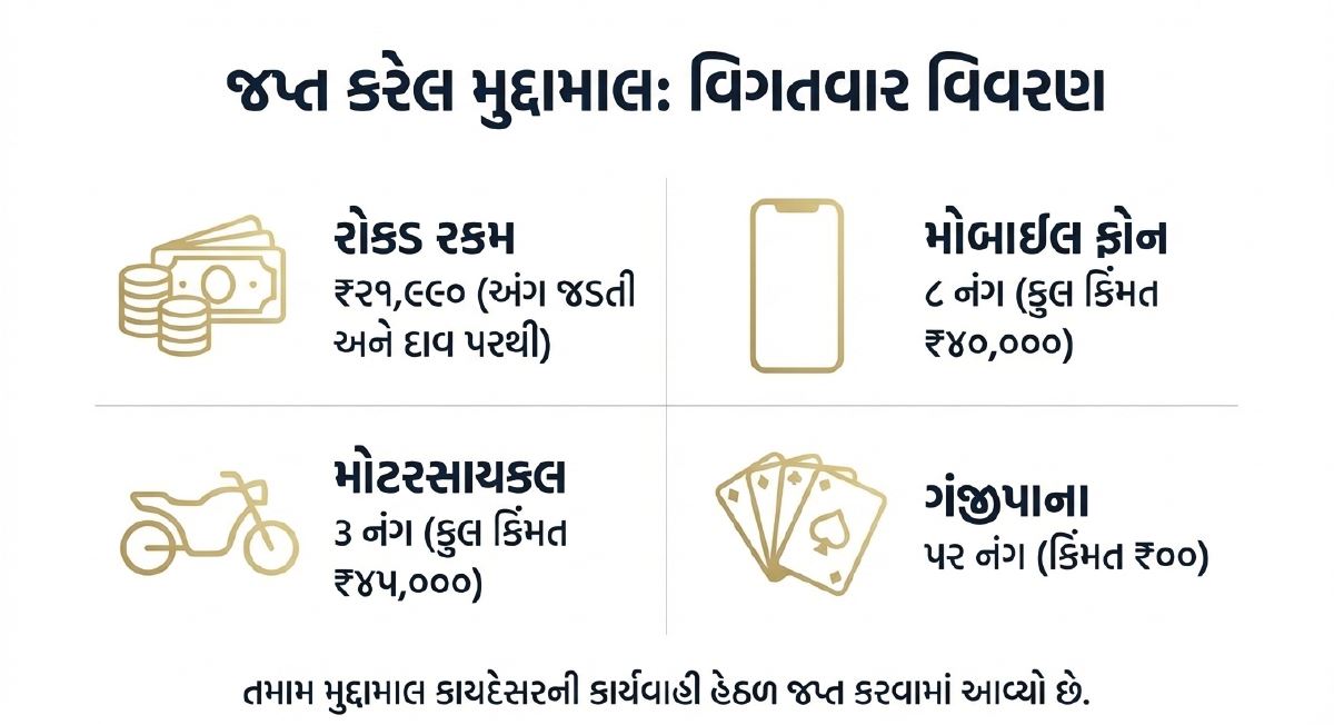 પોલીસે દરોડા દરમિયાન આરોપીઓ પાસેથી રોકડ રકમ અને વાહનો સહિતનો મુદ્દામાલ જપ્ત કર્યો છે, જેની વિગત નીચે મુજબ છે: