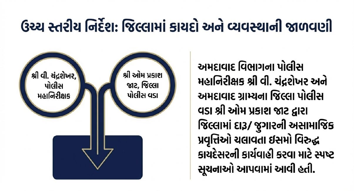 અમદાવાદ: અમદાવાદ ગ્રામ્ય જિલ્લામાં દારૂ અને જુગાર જેવી અસામાજિક પ્રવૃત્તિઓ ડામવા માટે પોલીસ દ્વારા કડક કાર્યવાહી શરૂ કરવામાં આવી છે. આ અંતર્ગત અમદાવાદ વિભાગના ઈ.પોલીસ મહાનિરીક્ષક વિધી ચૌધરી અને જિલ્લા પોલીસ વડા ઓમ પ્રકાશ જાટની સૂચના મુજબ વિશેષ ઝુંબેશ હાથ ધરાઈ છે. જે અનુસંધાને ધંધુકા પોલીસે ભાદર નદીના કાંઠે દરોડો પાડીને મોટા જુગારધામનો પર્દાફાશ કર્યો છે.