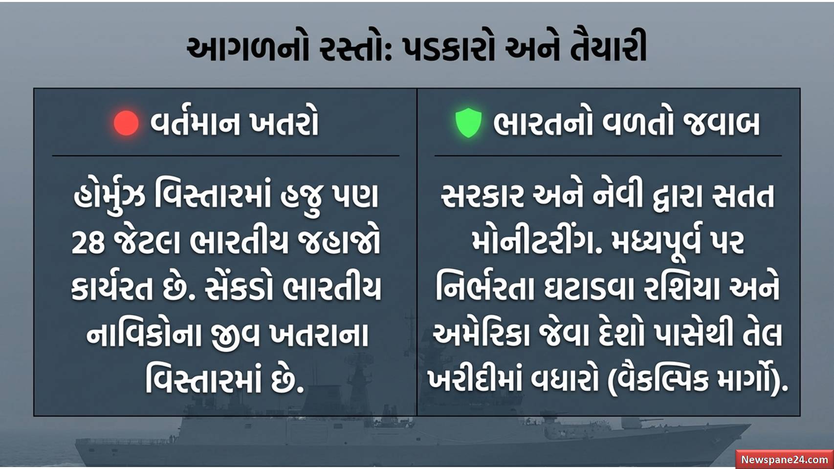 હજુ પણ હોર્મુઝ વિસ્તારમાં ભારતનાં આશરે 28 જહાજો અને સેંકડો ભારતીય નાવિકો કાર્યરત છે. ભારતીય નૌસેના અને સંબંધિત વિભાગો આ તમામ જહાજો પર સતત નજર રાખી રહ્યા છે.