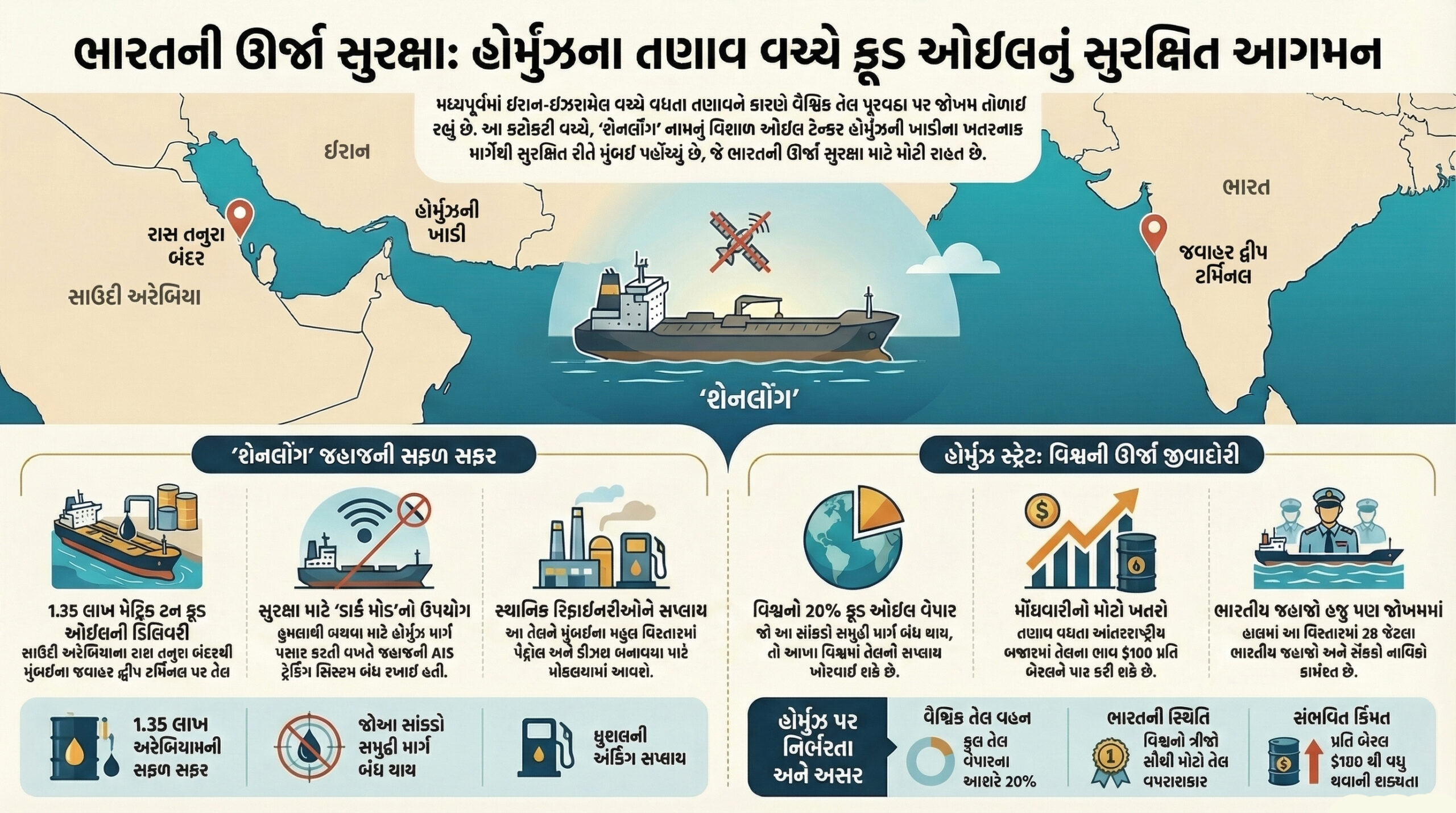 મધ્યપૂર્વ યુદ્ધ : ભારત વિશ્વનો ત્રીજો સૌથી મોટો તેલ વપરાશકાર દેશ છે. આપણે આપણી જરૂરિયાતનું મોટાભાગનું તેલ આયાત કરીએ છીએ. જો હોર્મુઝ માર્ગ ખોરવાય, તો ભારતમાં પેટ્રોલ અને ડીઝલના ભાવ આસમાને પહોંચી શકે છે, જેની સીધી અસર સામાન્ય માણસના ખિસ્સા પર પડે છે. શેનલોંગના આગમનથી સાબિત થયું છે કે યુદ્ધના વાદળો વચ્ચે પણ ભારતનો તેલ પુરવઠો હજુ અકબંધ છે.
