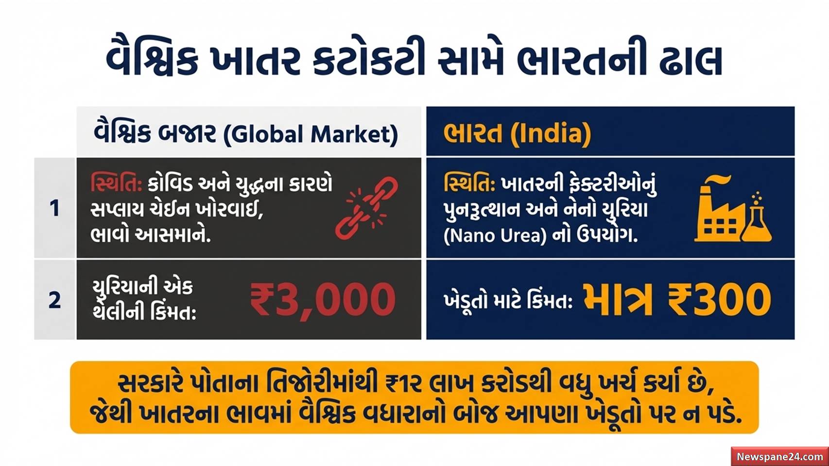 મોદીનો માસ્ટરસ્ટ્રોક : પ્રધાનમંત્રીએ ખેડૂતોને આશ્વાસન આપ્યું હતું કે આંતરરાષ્ટ્રીય સ્તરે ગમે તેવી કટોકટી આવે, સરકાર ખેડૂતો પર બોજ પડવા દેશે નહીં. તેમણે ઉદાહરણ આપતા કહ્યું કે, જે યુરિયાની થેલી આંતરરાષ્ટ્રીય બજારમાં ₹3,000માં મળે છે, તે ભારત સરકાર ખેડૂતોને માત્ર ₹300માં આપી રહી છે. આ માટે સરકારે પોતાની તિજોરીમાંથી ₹12 લાખ કરોડથી વધુનો ખર્ચ કર્યો છે.