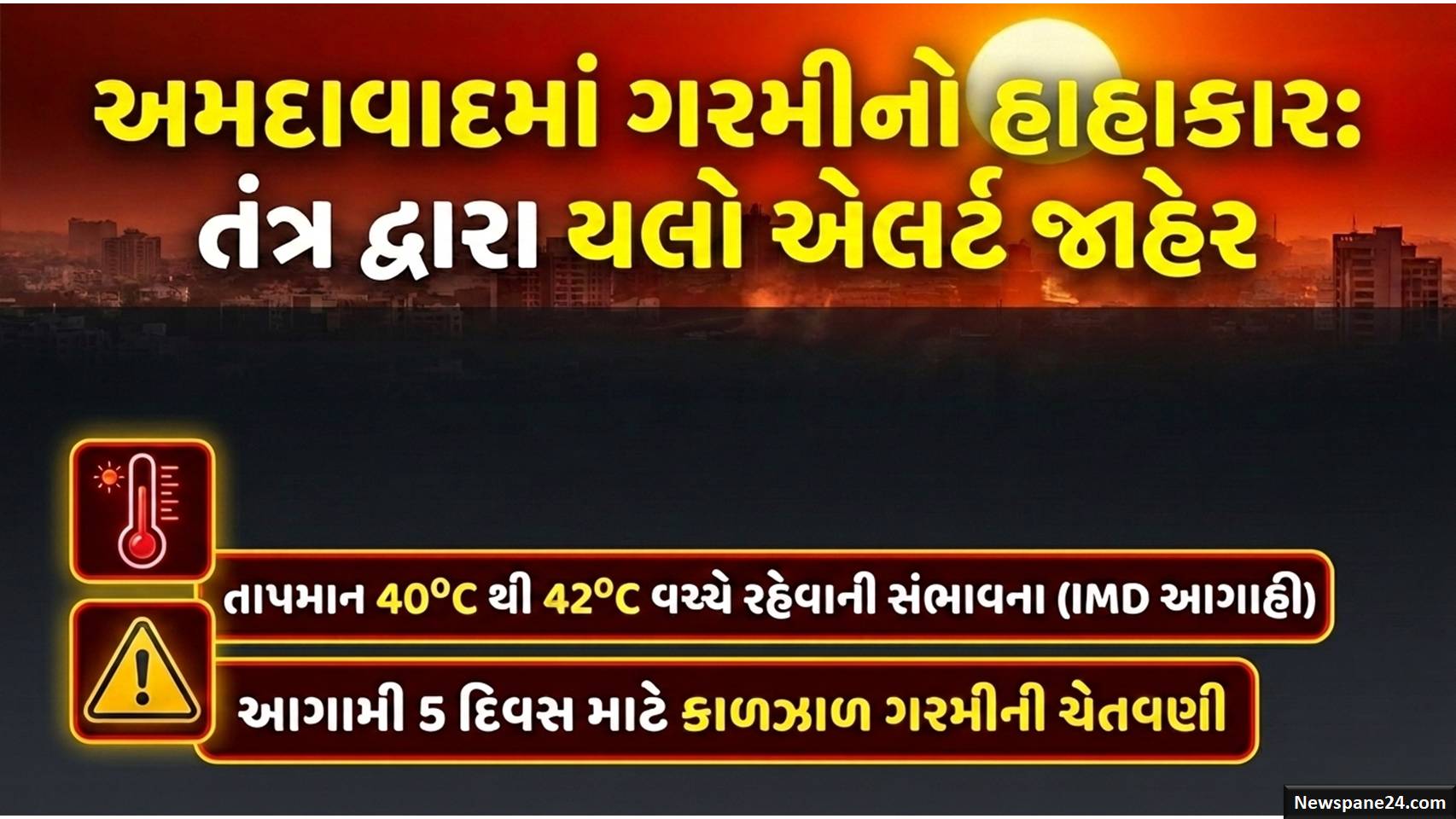 અમદાવાદ: શહેરમાં ઉનાળાએ હવે તેનું રૌદ્ર સ્વરૂપ બતાવવાનું શરૂ કર્યું છે. જાણે આખું અમદાવાદ ભઠ્ઠીમાં શેકાઈ રહ્યું હોય તેવો અહેસાસ થઈ રહ્યો છે. હવામાન વિભાગ (IMD) દ્વારા આજથી શહેરમાં સત્તાવાર રીતે ‘યલો એલર્ટ’ જાહેર કરવામાં આવ્યું છે. આગામી પાંચ દિવસ સુધી તાપમાનનો પારો 40 થી 42 ડિગ્રી સુધી જવાની પૂરેપૂરી શક્યતા છે.