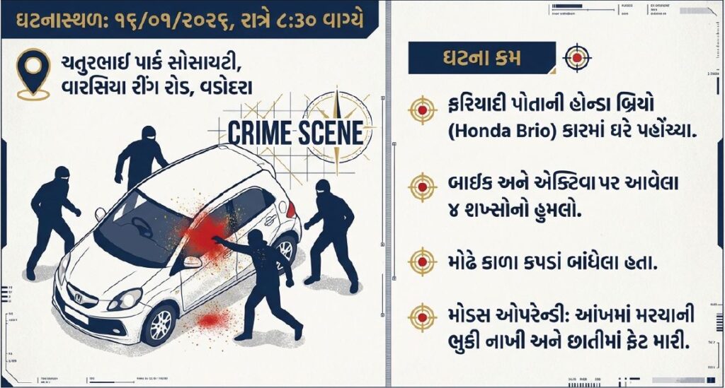 વડોદરા લૂંટ : ૧૬/૦૧/૨૦૨૬ના રોજ કારેલીબાગ વિસ્તાર નજીક આવેલી પોતાની ગિફ્ટ શોપ બંધ કરી ફરીયાદી રાત્રે આશરે ૮:૩૦ વાગ્યે વારસિયાના ચતુરભાઈ પાર્ક સોસાયટી ખાતે પોતાના ઘરે પહોંચ્યા હતા. કાર પાર્ક કરી નીચે ઉતરતાં જ બાઈક અને એક્ટિવા પર આવેલા ચાર યુવાનોએ અચાનક હુમલો કર્યો.