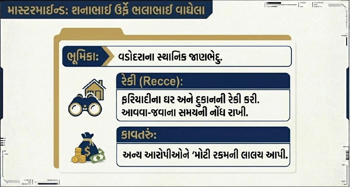 વડોદરા લૂંટ : પૂછપરછ દરમિયાન ખુલ્યું કે આરોપી શનાભાઈ ઉર્ફે ભલાભાઈ વાઘેલા ફરીયાદીની દુકાન, ઘર અને આવન-જાવનનો સમય જાણી પૂરેપૂરી રેકી કરી હતી. ત્યારબાદ સહઆરોપીઓને માહિતી આપી લૂંટનું આયોજન કરાયું.