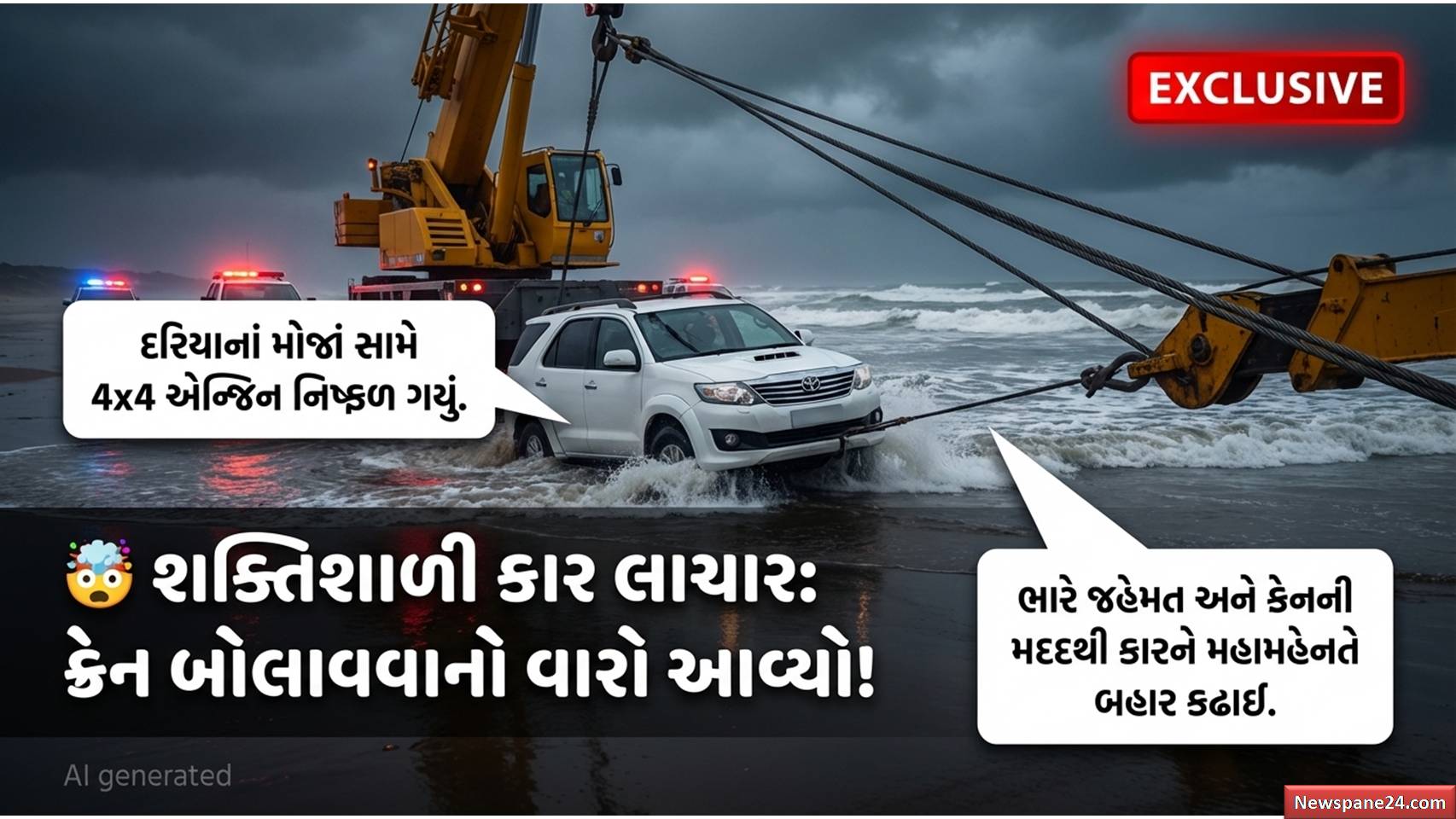 🌊 દરિયાના મોજાં સામે ફોર્ચ્યુનરનું જોર ન ચાલ્યું: હાઈ ટાઈડમાં ફસાયેલી ગાડીને ક્રેનથી ખેંચવી પડી, ડ્રાઈવરની ધરપકડ!
