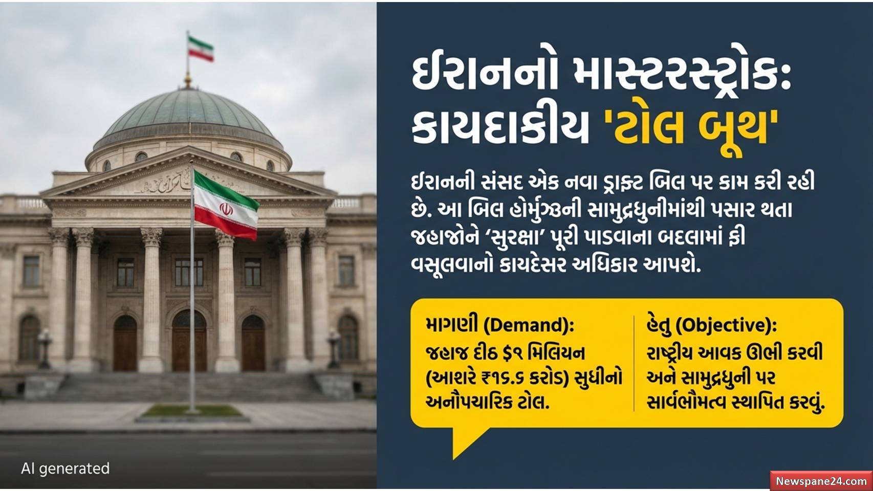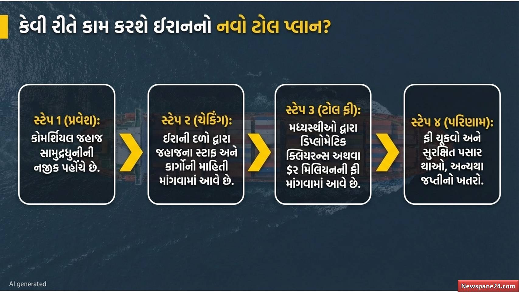 કેટલાક સૂત્રોના જણાવ્યા અનુસાર, ઈરાન પહેલેથી જ અનૌપચારિક રીતે જહાજો પાસેથી 20 લાખ ડોલર (આશરે 16 કરોડ રૂપિયાથી વધુ) સુધીનો ટોલ માંગી રહ્યું છે. હવે આ વ્યવસ્થાને કાયદેસરનું રૂપ આપવામાં આવી રહ્યું છે.
