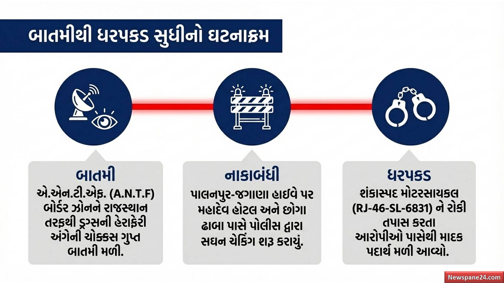 સી.આઈ.ડી. ક્રાઈમને ચોક્કસ બાતમી મળી હતી કે પાલનપુર હાઈવે પરથી નશીલા પદાર્થોની હેરાફેરી થવાની છે. આ બાતમીના આધારે એસ.પી. લોકેશ યાદવ અને ડીવાયએસપી એસ. જે. બલોચના માર્ગદર્શન હેઠળ પોલીસે જગાણા હાઈવે પર મહાદેવ હોટલ અને છોગા ઢાબા પાસે વોચ ગોઠવી હતી.