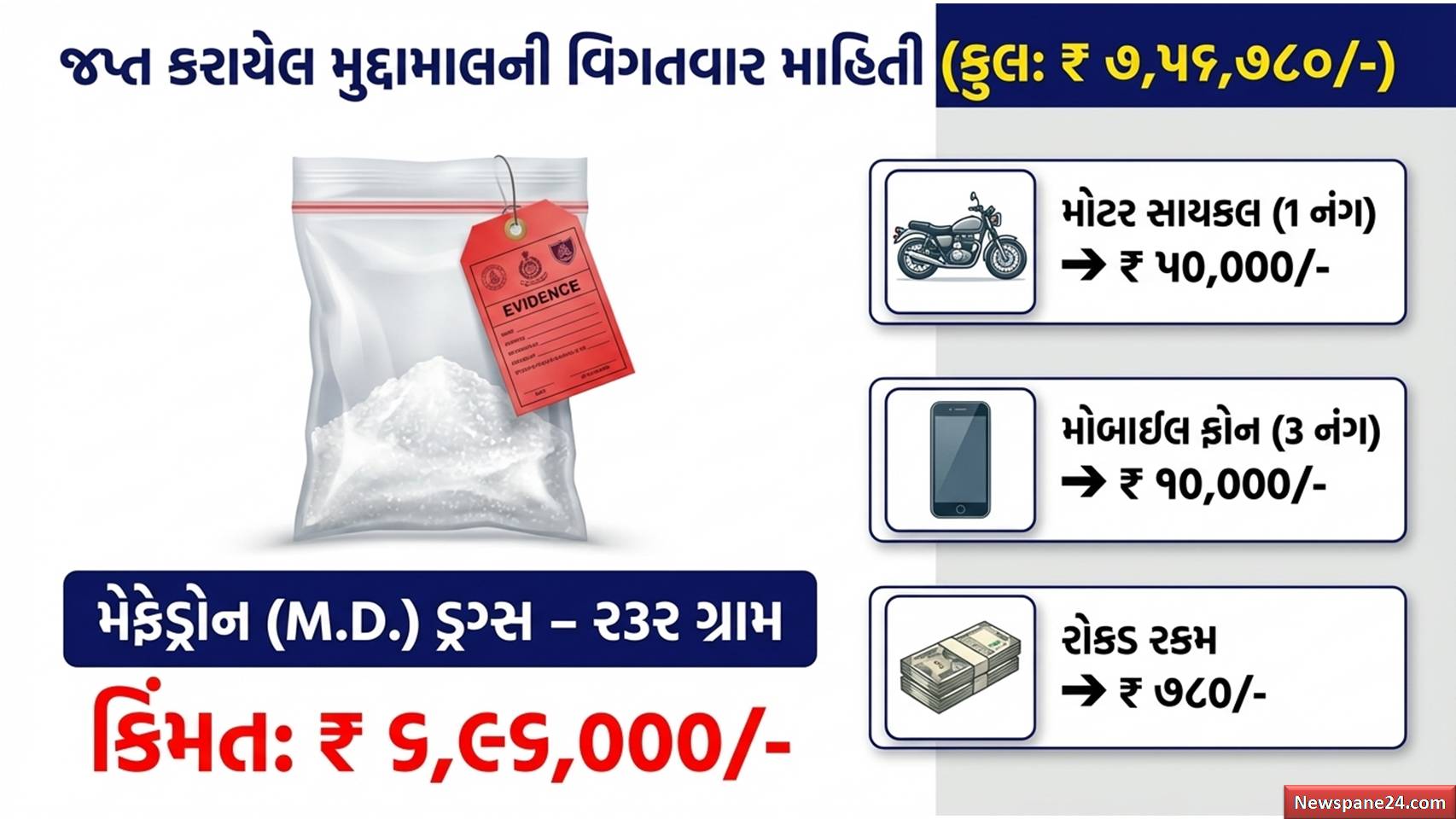 - મેફેડ્રોન ડ્રગ્સ: 232 ગ્રામ (કિંમત ₹6,96,000)