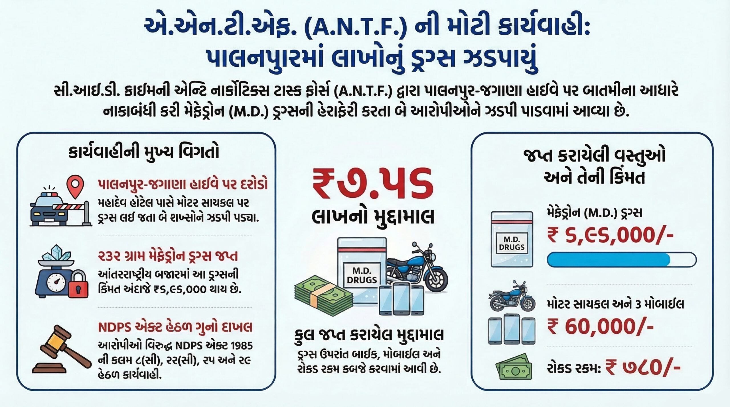 બનાસકાંઠા: ગુજરાતમાં ડ્રગ્સના દૂષણને ડામવા માટે પોલીસ એક્શન મોડમાં છે. તેવામાં પાલનપુર વિસ્તારમાં સી.આઈ.ડી. ક્રાઈમની એન્ટી નાર્કોટિક્સ ટાસ્ક ફોર્સ (A.N.T.F) ને એક મોટી સફળતા મળી છે. પાલનપુર-જગાણા હાઈવે પર લાખોની કિંમતના નશીલા પદાર્થ સાથે બે શખ્સોને દબોચી લેવામાં આવ્યા છે.