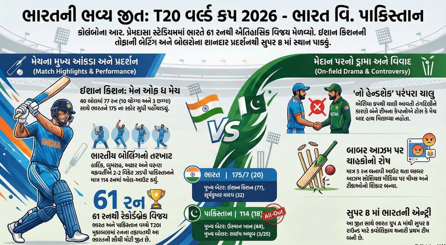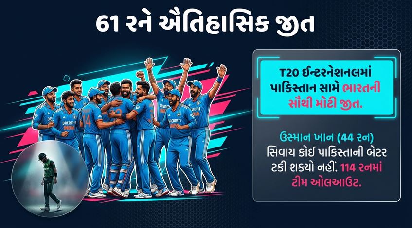 T20 વર્લ્ડ કપ 2026 : 15 ફેબ્રુઆરી, 2026ના રોજ કોલંબોના આર. પ્રેમદાસા સ્ટેડિયમમાં રમાયેલ T20 વર્લ્ડ કપનો ‘મહાસંગ્રામ’ વાસ્તવમાં પાકિસ્તાન માટે ‘મહા મોયે મોયે’ પળ સાબિત થઈ છે. ભારતે પાકિસ્તાનને 61 રનના રેકોર્ડબ્રેક અંતરથી હરાવીને સાબિત કરી દીધું છે કે નામ મોટા પણ દર્શન ખોટા જેવી હાલત અત્યારે પાડોશી દેશની ટીમની છે. ભારત અને પાકિસ્તાન વચ્ચેના T20 ઇતિહાસમાં રનની દ્રષ્ટિએ આ સૌથી મોટી જીત છે.