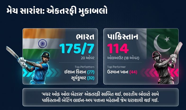 T20 વર્લ્ડ કપ 2026 : સ્ટેન્ડમાં જ્યારે પૂર્વ કેપ્ટન રોહિત શર્મા અને ICC ચેરમેન જય શાહ એકસાથે બેસીને મેચનો આનંદ માણી રહ્યા હતા, ત્યારે મેદાન પર પાકિસ્તાની બેટિંગ લાઈન-અપ પત્તાના મહેલની જેમ તૂટી રહી હતી. હાર્દિક પંડ્યાએ પહેલી જ ઓવરમાં વિકેટ-મેડન નાખીને પાકિસ્તાનીઓને ‘શૂન્ય’ની કિંમત સમજાવી દીધી હતી. 176 રનનો પીછો કરવા ઉતરેલું પાકિસ્તાન 114 રનમાં ઓલઆઉટ થઈ ગયું, જે ભારત સામે તેમનો રનની દ્રષ્ટિએ સૌથી મોટો પરાજય છે. આ જીત પછી પોઈન્ટ ટેબલમાં પાકિસ્તાન અત્યારે USA કરતા પણ નીચે ત્રીજા સ્થાને ફેંકાઈ ગયું છે, જે તેમના માટે કોઈ શરમજનક હારથી ઓછું નથી