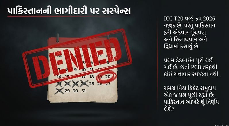ICC T20 વર્લ્ડ કપ 2026 ને લઈને પાકિસ્તાન ફરી એકવાર ગૂંચવણ અને દ્વિધામાં ફસાયું છે. પાકિસ્તાન ક્રિકેટ બોર્ડ (PCB)ના ચેરમેન મોહસિન નકવી દ્વારા નક્કી કરાયેલી પ્રથમ ડેડલાઈન પૂરી થઈ ગઈ હોવા છતાં હજુ સુધી સત્તાવાર રીતે સ્પષ્ટ નથી કે પાકિસ્તાન આ પ્રતિષ્ઠિત ટૂર્નામેન્ટમાં કઈ રીતે ભાગ લેશે.