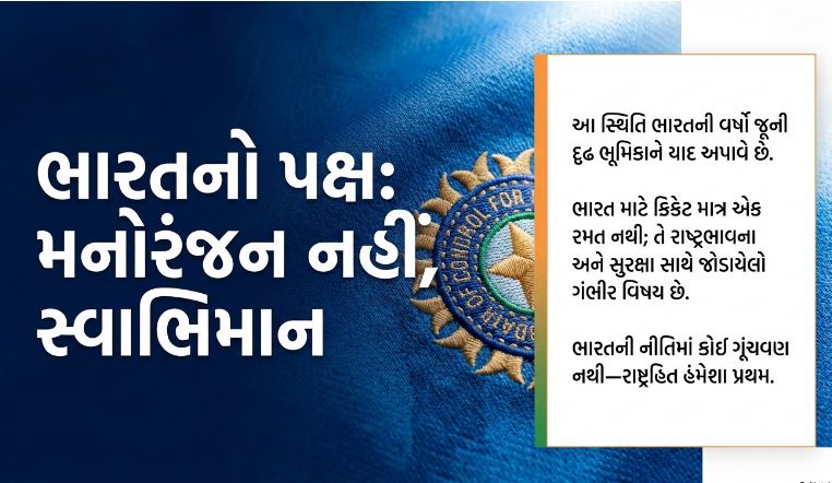 ભારત માટે ક્રિકેટ માત્ર મનોરંજન કે સ્પર્ધા નથી, પરંતુ રાષ્ટ્રભાવના, સુરક્ષા અને સ્વાભિમાન સાથે જોડાયેલ વિષય છે. ભારતે વારંવાર સ્પષ્ટ કર્યું છે કે આતંકવાદ અને રમત સાથે સાથે ચાલી શકે નહીં. જ્યારે પાકિસ્તાનની ધરતી પરથી આતંકવાદ ભારતની શાંતિ અને સુરક્ષાને પડકાર આપે છે, ત્યારે દ્વિપક્ષીય ક્રિકેટ સંબંધો ચાલુ રાખવા રાષ્ટ્રહિતના વિરુદ્ધ છે.